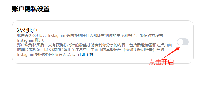 在“账户隐私设置“部分。您将看到一个名为“私密账户”的选项。将该选项旁边的开关切换为开启状态。